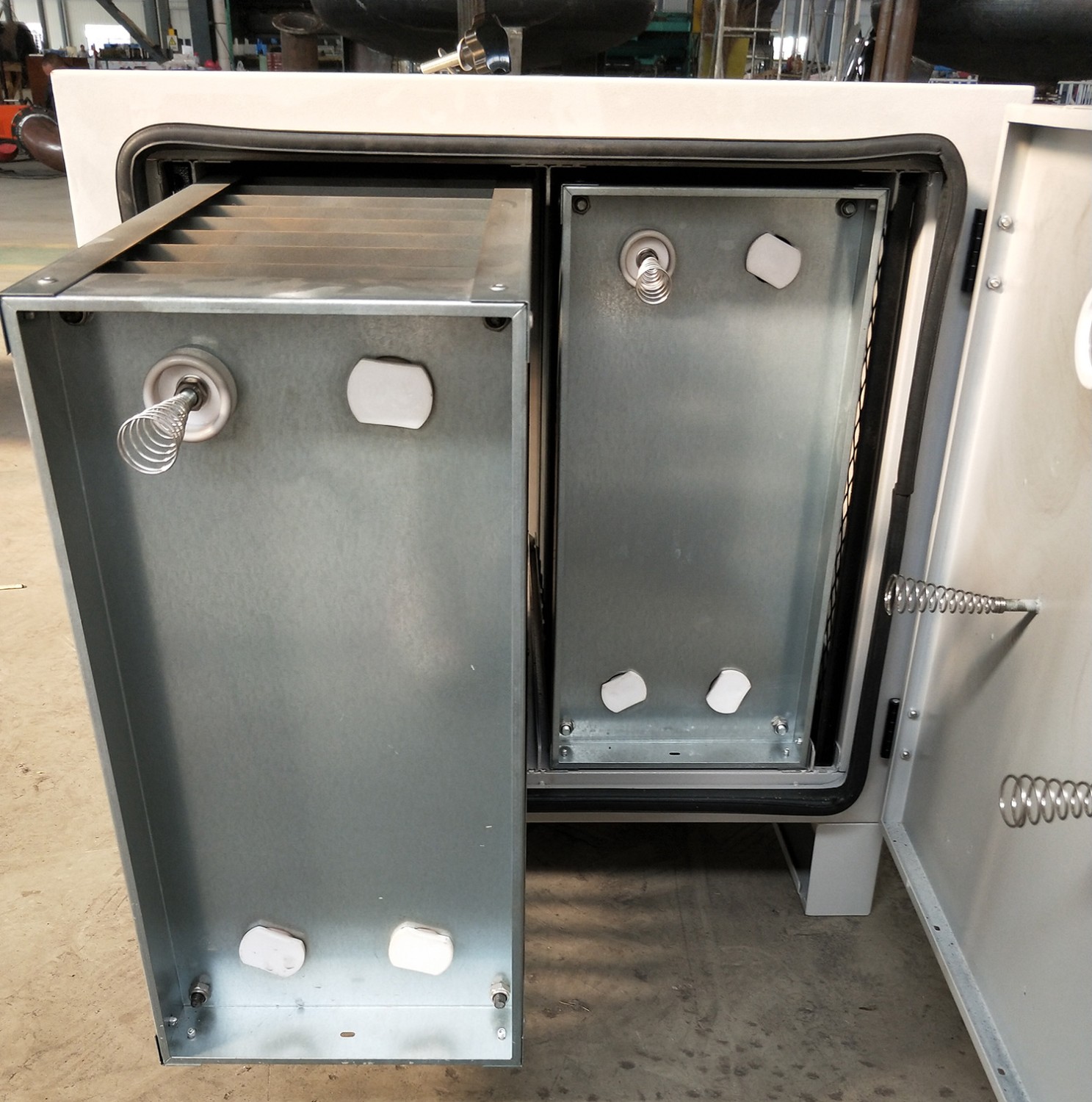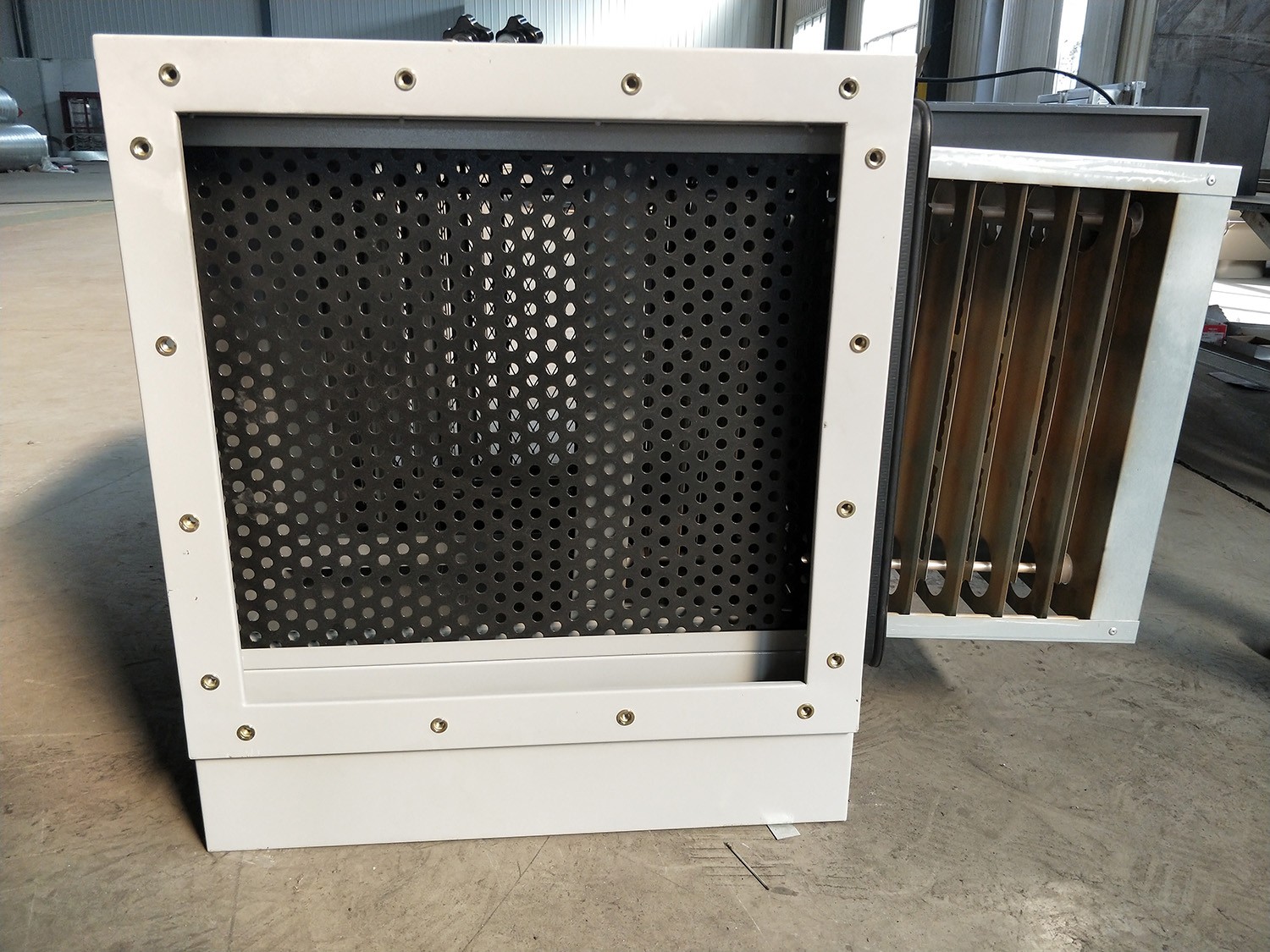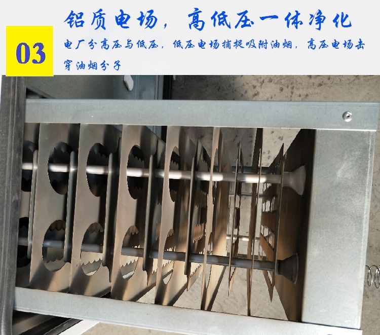 大顆粒油滴通過(guò)前擋板在自身重力作用下流入油槽排出。剩余的小粒徑污染物進(jìn)入離子高壓靜電區(qū),通過(guò)